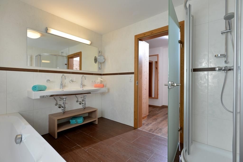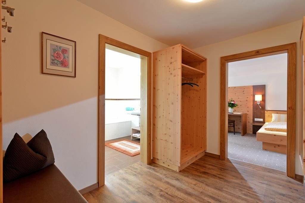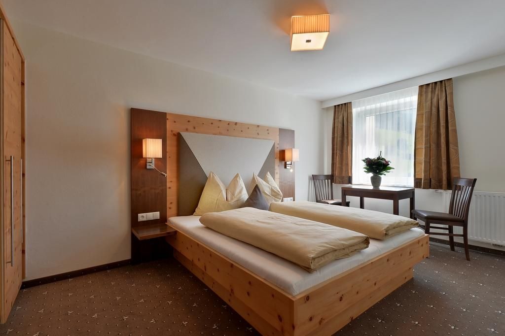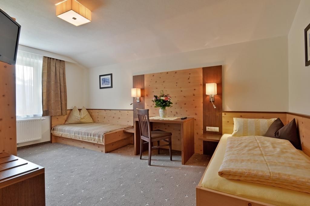Unser Familienzimmer bietet Platz für bis zu vier Personen und überzeugt mit liebevollen Details und alpinem Charme. Das Elternzimmer mit Doppelbett und das separate Kinderzimmer mit zwei Betten schaffen Privatsphäre und Wohlfühlatmosphäre zugleich. Teppich- und Holzboden, moderne Ausstattung und viel Tageslicht machen den Raum zu einem Ort des Zusammenseins – ideal für Familien, die Natur und Erholung suchen.